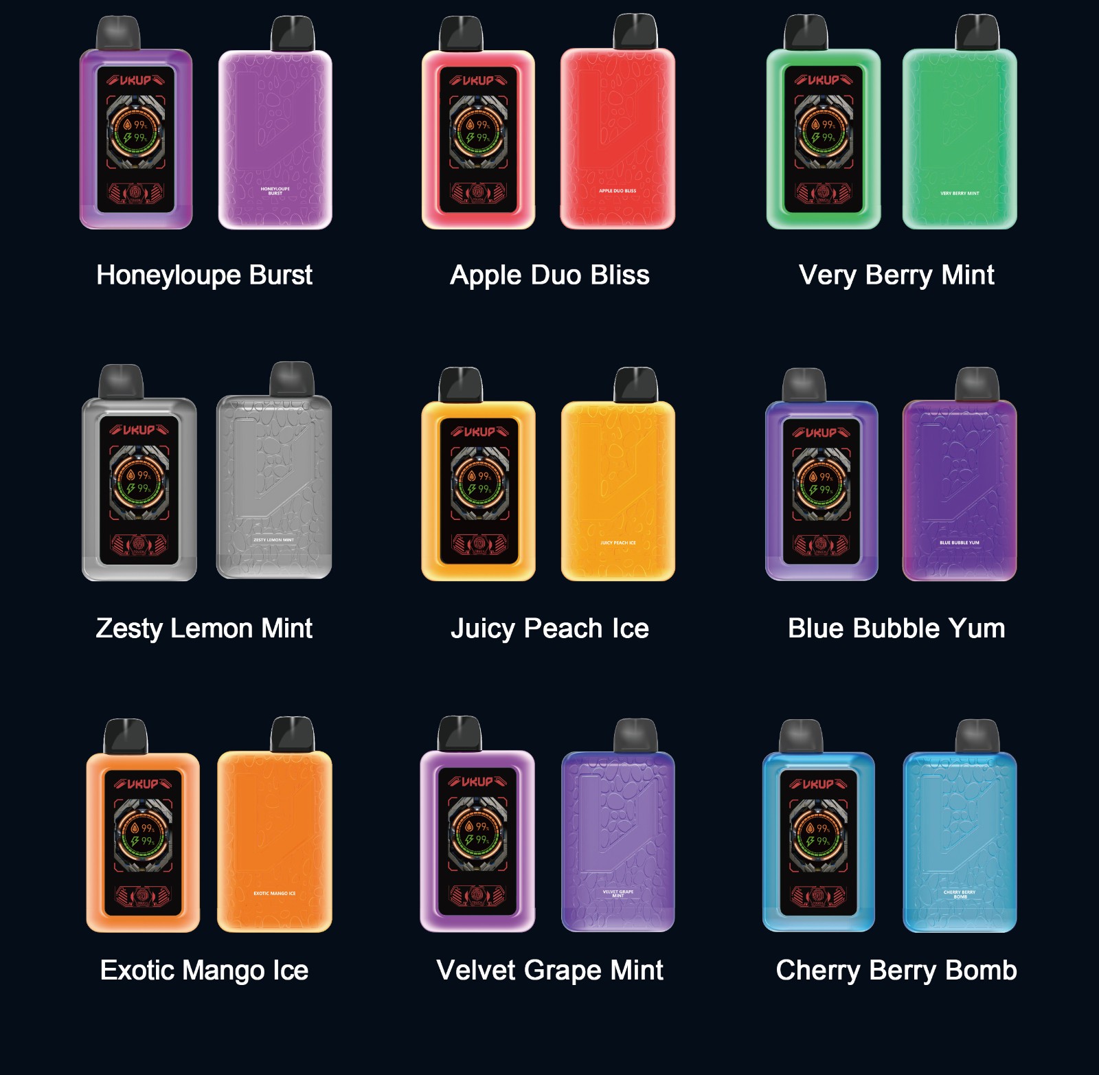 Cruchy Watermelon Ice/Minty Sweet Twist/Blue Razz Zing/Strawberry Party Punch/Winter Green/Very Berry Ice/Honeyloupe Burst/Apple Duo Bliss/Very Berry Mint/Zesty Lemon Mint/Juicy Peach Ice/Blue Bubble Yum/Exotic Mango Ice/Velvet Grape Mint/Cherry Berry Bom